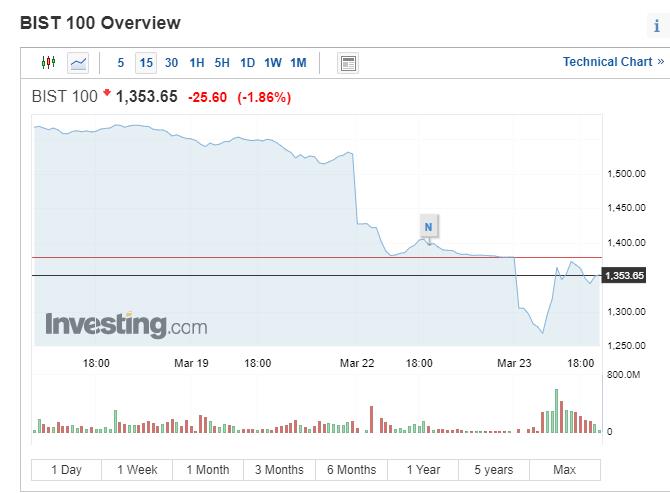 当地时间23日,土耳其股市开盘即下跌5.4%,连续两天触发熔断机制。一天前,土耳其股市、债市和汇率均大幅下挫,分析人士称,主张加息的土耳其原央行行长阿巴尔被解雇是该国金融市场震荡的主要原因。