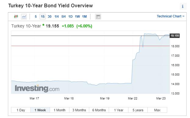 当天,土耳其国债价格也大幅下挫,10年国债收益率暴涨逾22%,创历史最大涨幅。