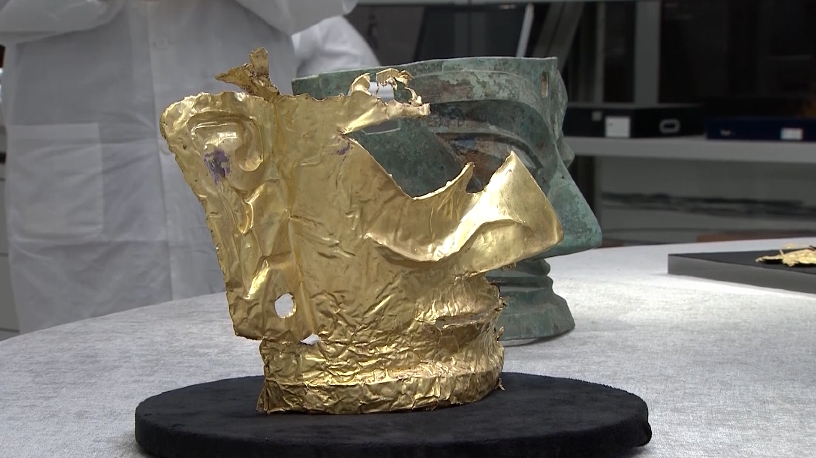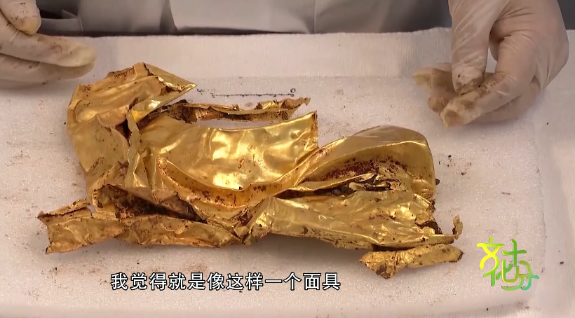 三星堆遗址考古发掘队副领队 四川大学考古文博学院教授 于孟洲:它褶皱得特别厉害,大家有的猜它可能就是罩在青铜人头像外面的金面具,有的人就猜它是不是裹在其它器物外面的,也有的人猜说它是不是金杖外面的包着的金箔,猜什么的都有。