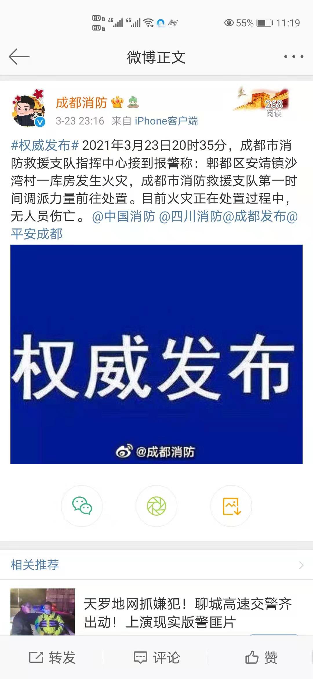 据成都消防消息:2021年3月23日20时35分,成都市郫都区安靖镇沙湾村一库房发生火灾,成都市消防救援支队第一时间调派力量前往处置。目前火灾正在处置过程中,暂无人员伤亡。 (总台央视记者 白璐)