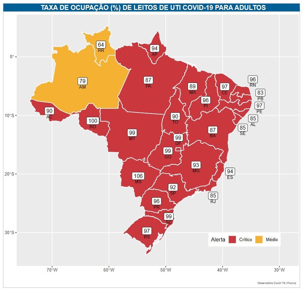 巴西最主要的公共卫生研究机构之一奥斯瓦尔多·克鲁斯基金会建议,所有因重症监护床位紧缺处于“严重警报”阶段的巴西各州,都应该在至少14天内限制非必要活动。