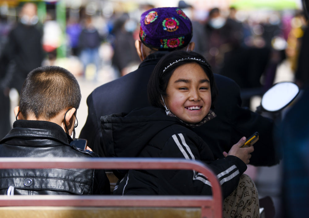 3月20日,在新疆哈密市宝农农贸市场,小朋友坐在电动车上逛巴扎。新华社记者王菲摄