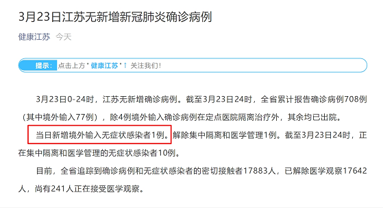 3月23日0—24时,江苏无新增新冠肺炎确诊病例。截至3月23日24时,江苏省累计报告确诊病例708例(其中境外输入77例),除4例境外输入确诊病例在定点医院隔离治疗外,其余均已出院。