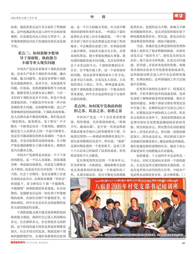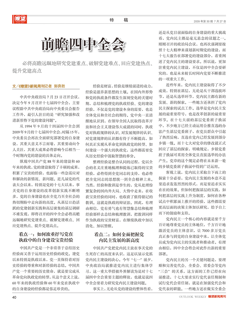 这种国家级的业务视角,必然也会受到海内外的热切关注。我曾经就有这样一次经历。2009年9月召开的中共十七届四中全会,主要议程除中共中央政治局向中央委员会报告工作外,最引人注目的是“研究加强和改进新形势下党的建设问题”。由于自己在这个领域的报道上有所积累,所以《瞭望》编辑部打来了约稿电话,希望能够写一篇关于四中全会的前瞻。这实际上是个艰巨的任务,源于与《瞭望》这份深厚的感情,我也不好推辞,硬着头皮接下了任务,经过反复思考、深思熟虑、苦思冥想后,写成了一篇近4000字的文章。