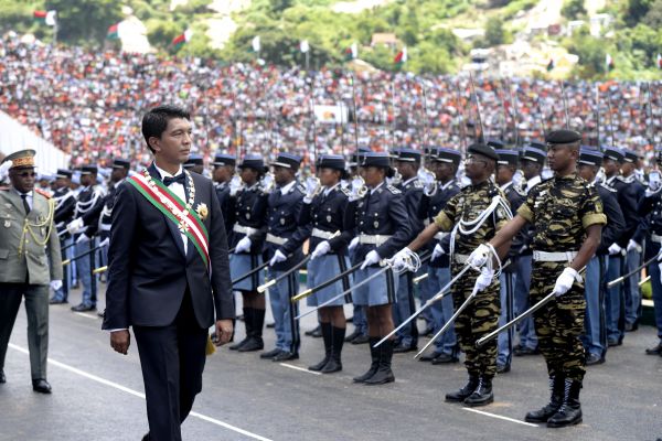 2019年1月19日,在马达加斯加首都塔那那利佛,拉乔利纳(前)检阅仪仗队。 新华社发(西塔卡摄)