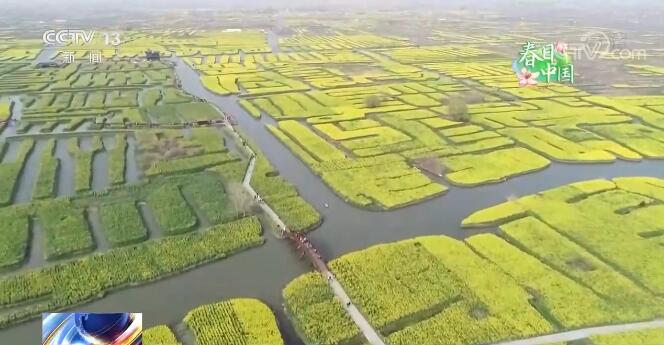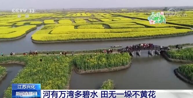 央视网消息:一沐春风万顷黄。现在我们看到的是位于江苏兴化的千垛油菜花。油菜花在垛田上集中绽放,金灿灿的颜色分外耀眼,与蓝天碧水交相辉映,呈现出“河有万湾多碧水,田无一垛不黄花”的壮观景色。