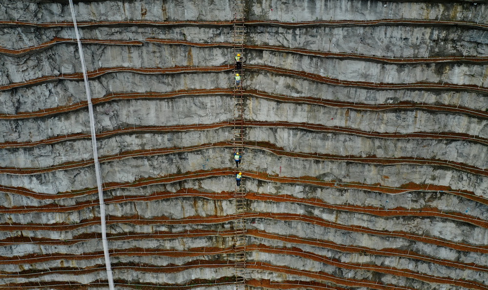 3月22日,在广西柳州市楼梯山山体复绿工程施工现场,工人沿着扶梯爬上陡峭的山体作业(无人机照片)。