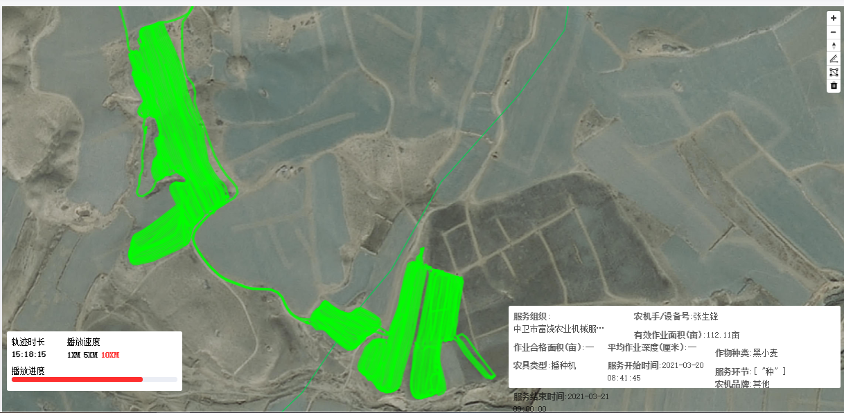 宁夏中卫市富饶农机服务有限公司的农机手张生峰在拓寨村播种黑小麦的作业轨迹截图。(受访者供图)