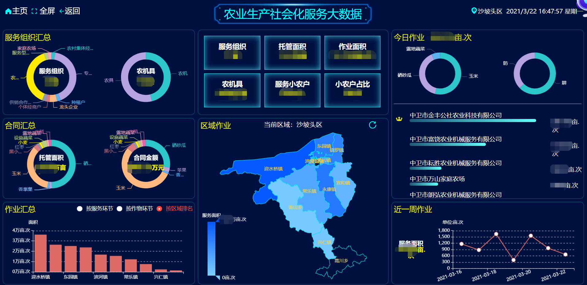 沙坡头区是全国第四批率先基本实现主要农作物生产全程机械化示范县,也是宁夏农业生产托管社会化服务的首个试点。去年以来,沙坡头区与第三方合作,引入农业生产社会化服务监督平台,建设农业农村大数据中心,对当地所有社会化服务组织的托管服务进行实时监管和平台各类数据的动态更新。