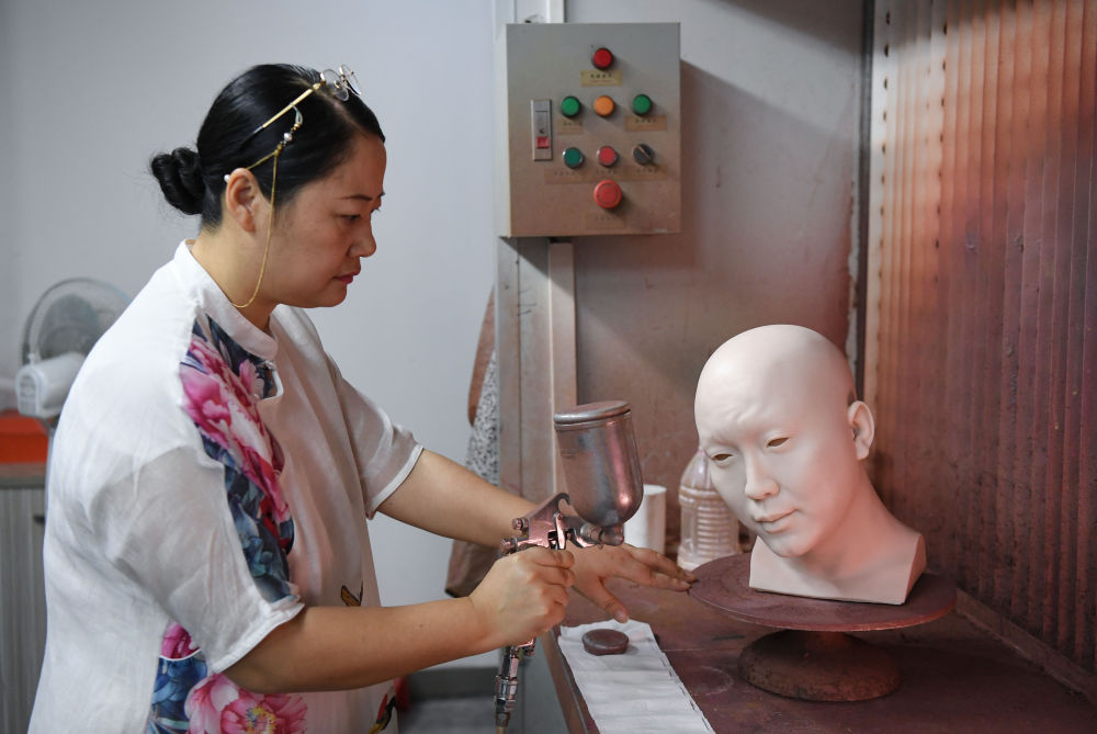 ↑在大象东方蜡像艺术公司,创始人周雪蓉在给一个蜡像头部喷色(2月8日摄)。