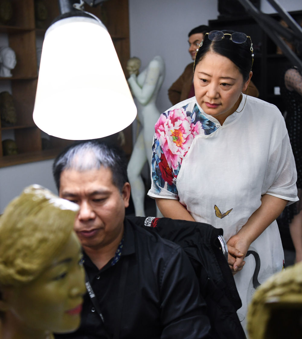 ↑ 在大象东方蜡像艺术公司,创始人周雪蓉(后)和进行泥稿创作的工作人员交流(2月8日摄)。