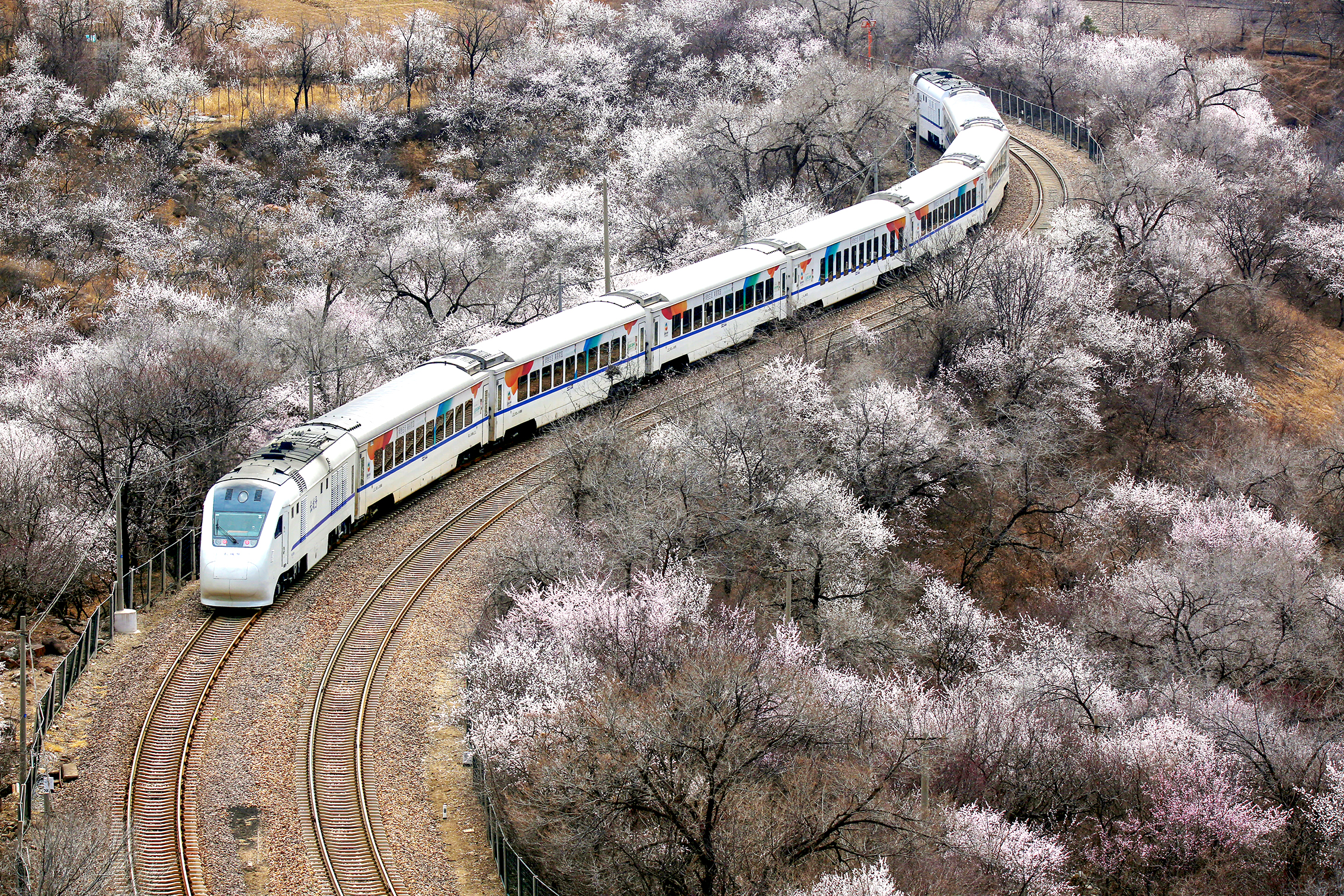 3月22日,北京居庸关长城脚下,S2线和谐号列车穿越花海。(北京市园林绿化局供图)