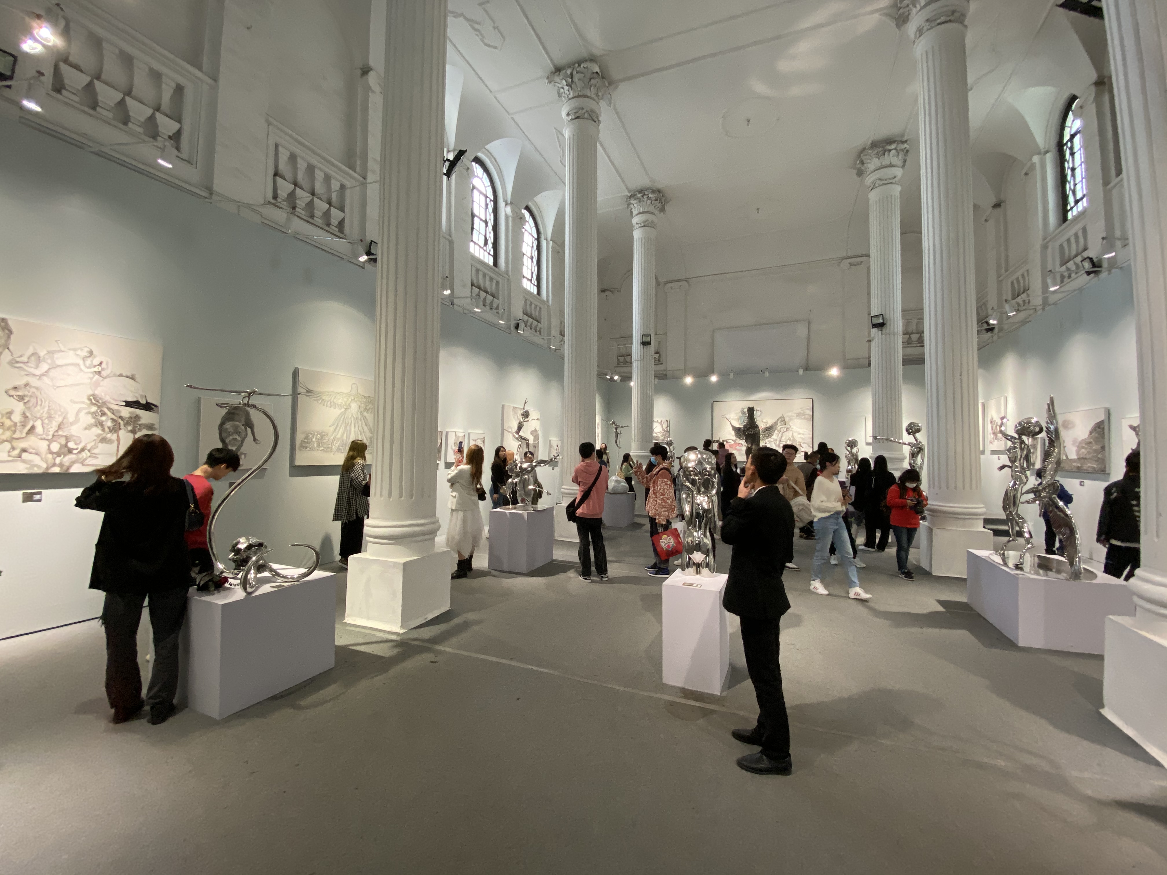 在位于重庆山城巷传统风貌区的一座百年教堂旧址内,一场名为《诗意的虫洞》的当代艺术展,用油画和雕塑的艺术形式将人、动物、植物置于历史与自然发展河流之中,每日吸引上万游人前来参观。不少人观展之余,还在留言簿上写下了长长的感言。