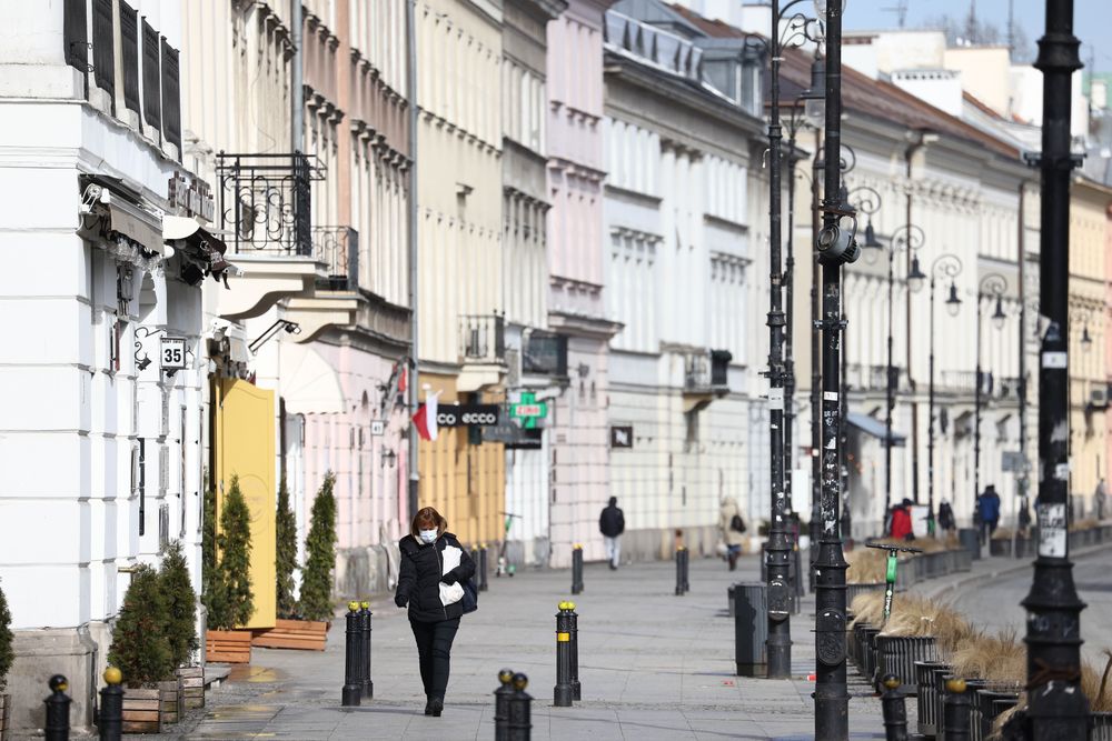 3月20日,在波兰首都华沙市中心,行人走在空旷的大街上。(新华社发,亚普·阿林摄)