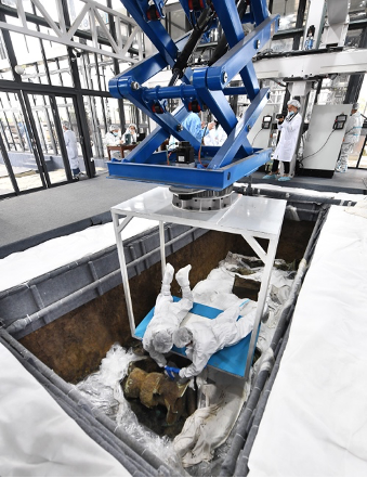 出于对脆弱文物研究保护的需要,这里的发掘环境堪称一流。由钢筋和玻璃构建的发掘仓内配备了用于环境调控、工作视频记录、多功能考古操作等工作系统。文物的发掘在恒温恒湿的环境中进行,相对稳定的发掘环境对于出土文物具有重要的保护作用。由于每个“祭祀坑”里都铺满了层层叠叠的文物,使得发掘队员没有可供下脚支撑的空间,多功能考古操作系统可以方便发掘人员“悬空”操作、实现文物安全调运和数据采集等工作。
