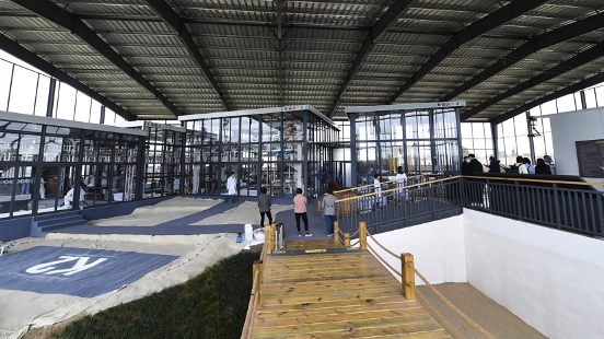 ↑ 进入三星堆遗址祭祀区发掘现场的大棚后可见由钢筋玻璃建构的彼此通连的考古工作仓