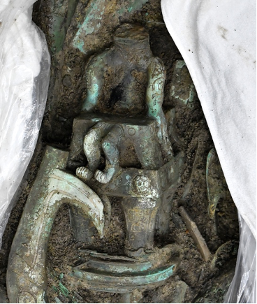 ↑ 在媒体的报道中,出土的黄金面具曝光率极高,而另一件令人匪夷所思的青铜器让眼尖的考古专家们啧啧称奇——一件人尊合体的青铜器,这件器物在中国考古史中尚属首次发现,它造型奇特,迥异于已知的任何类型青铜器。