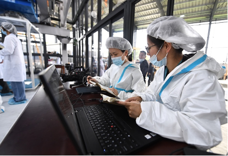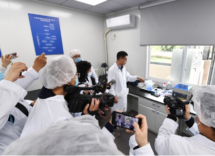 ↑ 工作人员向媒体记者讲解应急监测分析室的功能作用。