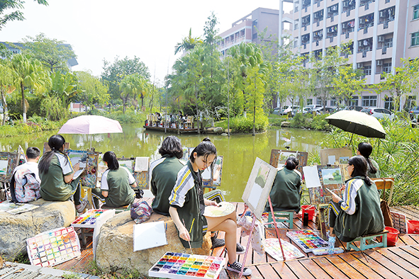 ↑东莞市第五高级中学学生在校园中上美术课。受访者供图