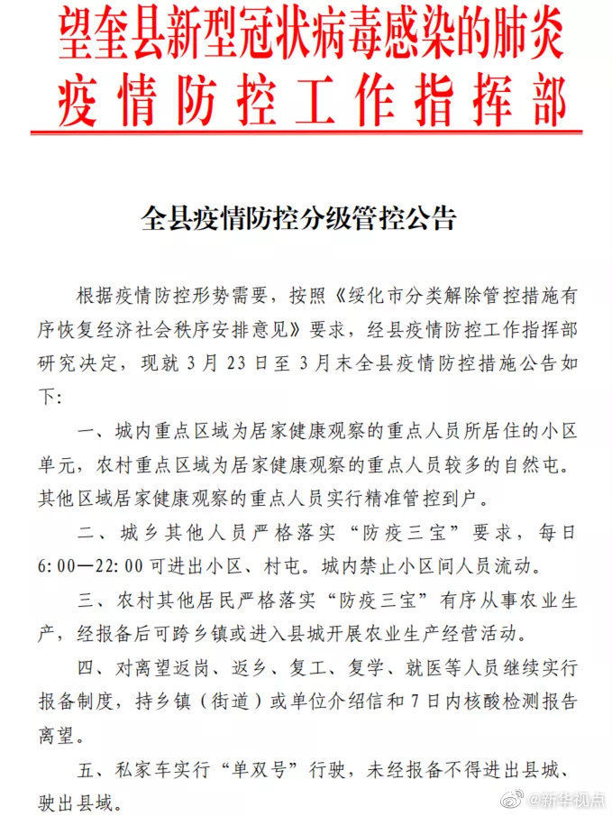 3月22日,黑龙江省望奎县新冠肺炎疫情防控工作指挥部发布,内容大致就是要求全县仍施行“加码”式严管,比如私家车“单双号”行驶,未经报备不得进出县城、驶出县域等。这不由得让群众惊出一身冷汗——“这是又有情况吗?”“整啥呢,又有病例了吗?”