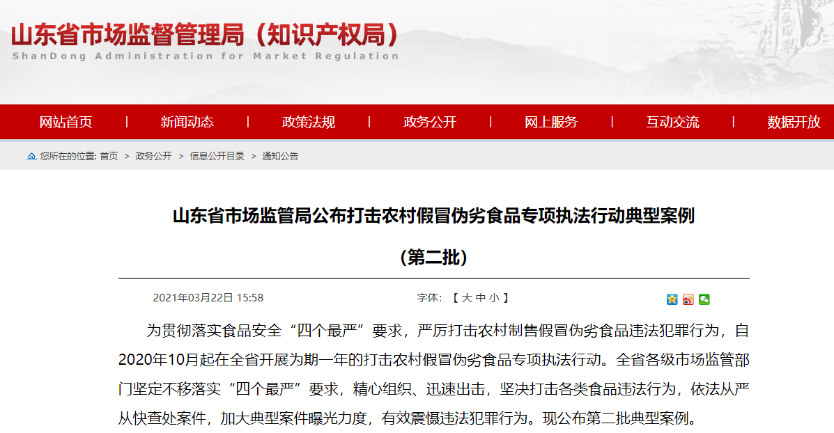 记者从山东省市场监督管理局获悉,为贯彻落实食品安全“四个最严”要求,严厉打击农村制售假冒伪劣食品违法犯罪行为,自2020年10月起在山东省开展为期一年的打击农村假冒伪劣食品专项执法行动。山东省各级市场监管部门坚定不移落实“四个最严”要求,精心组织、迅速出击,坚决打击各类食品违法行为,依法从严从快查处案件,加大典型案件曝光力度,有效震慑违法犯罪行为。现公布第二批典型案例。