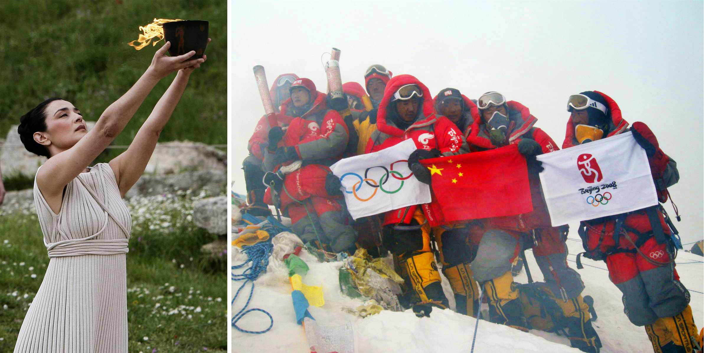 左图为2008年3月24日,北京奥运会圣火取火仪式在希腊奥林匹亚举行,最高女祭司举起火种罐。右图为2008年5月8日,登山队员在珠穆朗玛峰峰顶展示中国国旗、奥运五环旗和北京奥运会会徽旗。新华社发