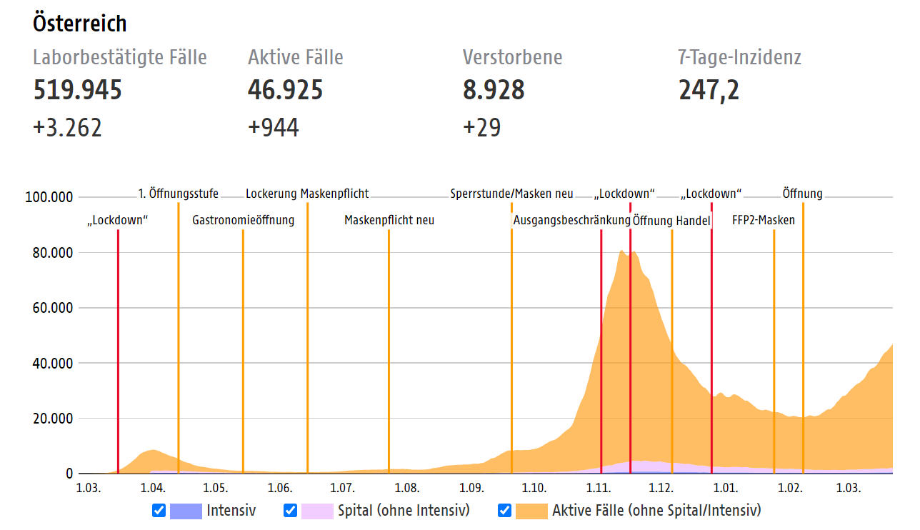 根据奥地利卫生部于当地时间3月24日公布的疫情数据,奥地利新增新冠肺炎确诊病例3262例,累计确诊519945例;新增死亡病例29例,累计死亡8928例;累计康复病例464092例,目前有1614名患者住院治疗,438名患者在重症监护病房。(总台记者 朱赫)