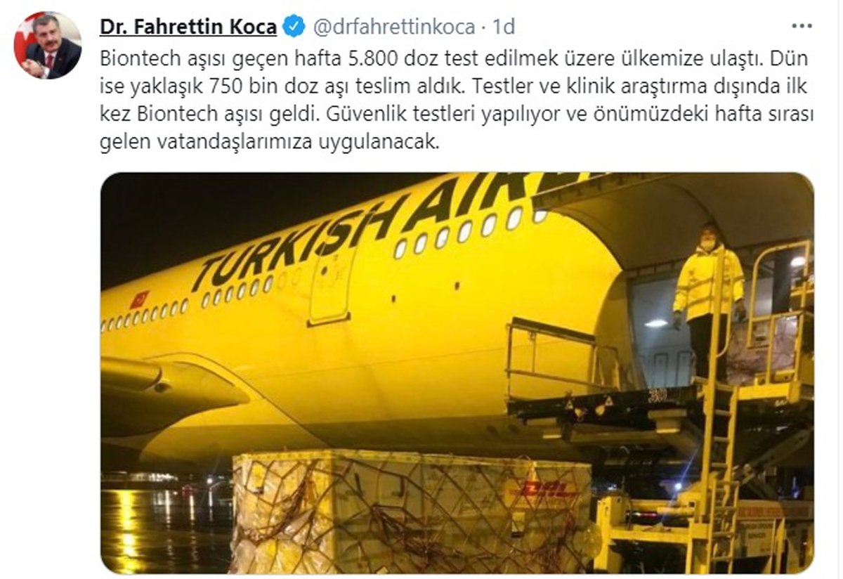 当地时间3月24日晚,土耳其卫生部长科贾在社交平台上发文称,土耳其已于3月23日收到了大约75万剂德国生物新技术公司(BioNTech)的疫苗,24日又有70多万剂该公司疫苗抵达土耳其。目前土耳其一共有约140万剂德国生物新技术公司的疫苗可供接种。
