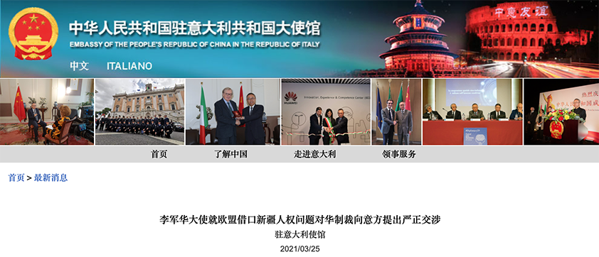 当地时间3月24日,中国驻意大利大使李军华就欧盟借口所谓新疆人权问题作出单边对华制裁的决定,向意大利外交部提出严正交涉。