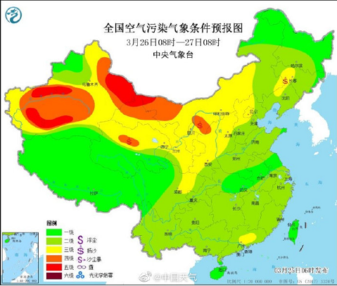 其中,今天(25日)新疆东部和南疆盆地、内蒙古西部、青海北部和东部、甘肃中北部、宁夏、陕西西北部等地有扬沙或浮尘天气,内蒙古西北部、甘肃中部等地局地有沙尘暴。