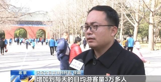 天坛公园管理科科长 任超:随着春暖花开天气的转好,游客量也从2万多人增加到每天的日均游客量3万多人,增加了也是将近30%多。外地团的数量剧增,由原来的20多个增长到现在日均180个 。