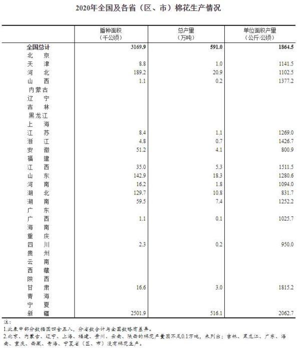 2020年全国及各省(区、市)棉花生产情况。来自国家统计局。