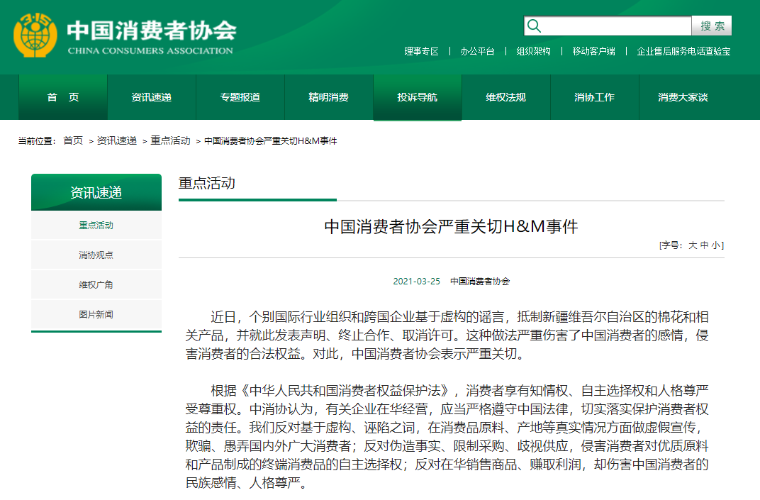 今天(25日),中国消费者协会发文称,近日,个别国际行业组织和跨国企业基于虚构的谣言,抵制新疆维吾尔自治区的棉花和相关产品,并就此发表声明、终止合作、取消许可。这种做法严重伤害了中国消费者的感情,侵害消费者的合法权益。对此,中国消费者协会表示严重关切。