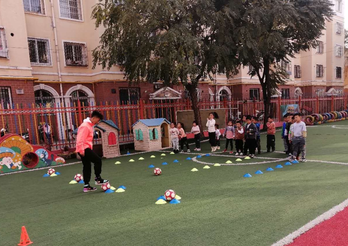 图为恒利俱乐部教练员吴军强去到平罗县星海花园幼儿园,免费为学生上足球训练课。