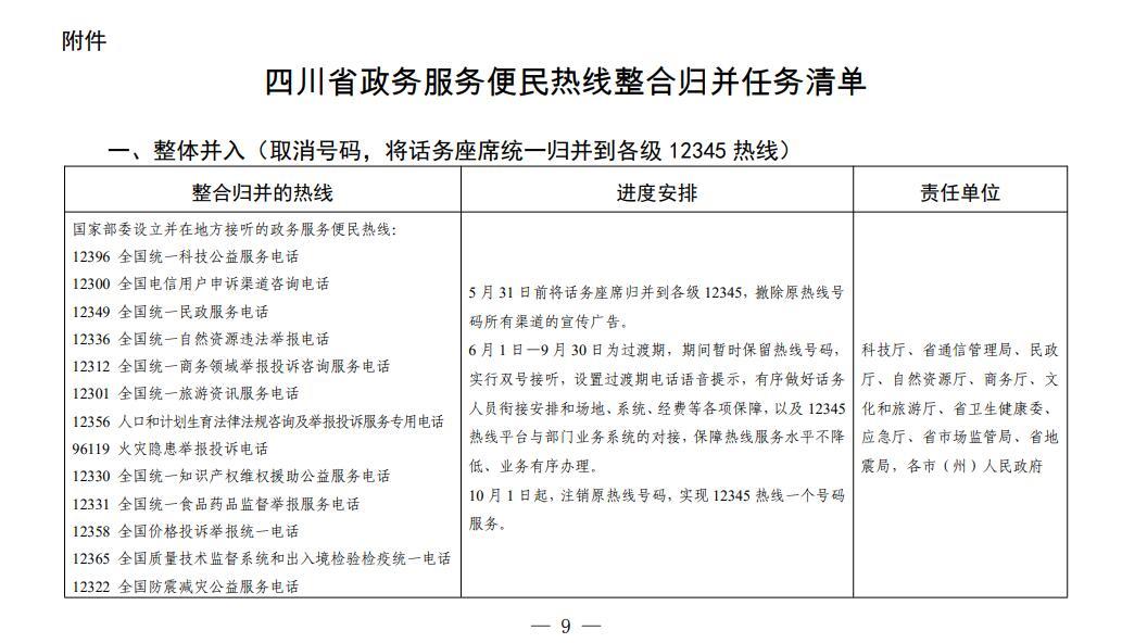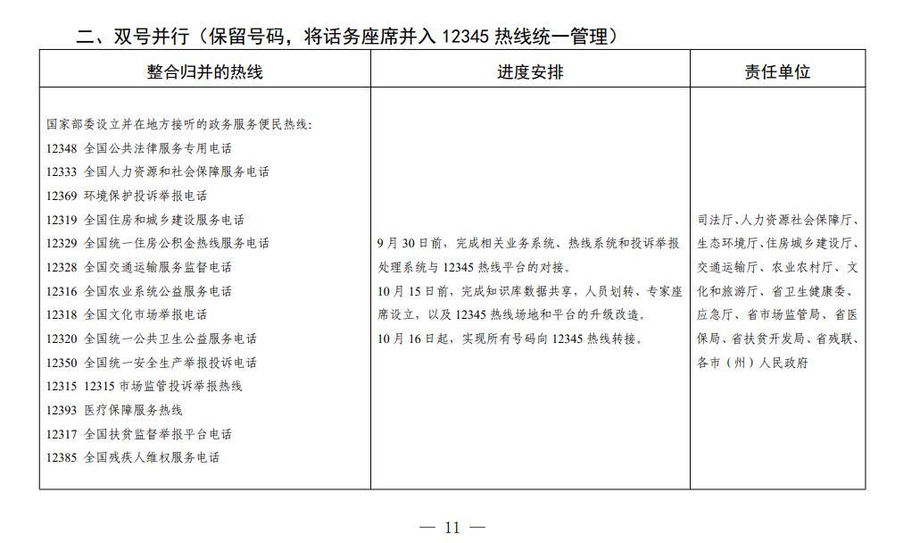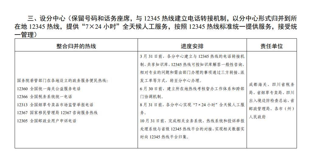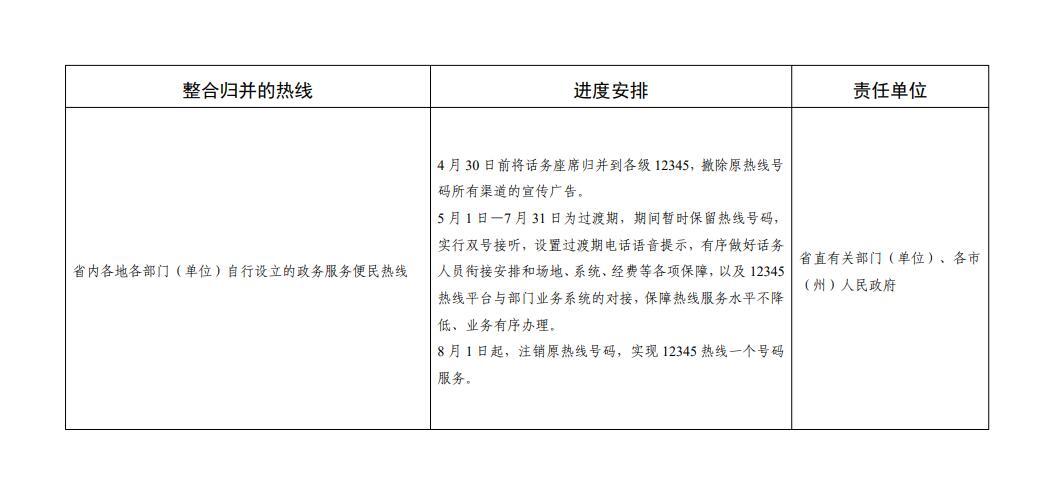 (二)整合地方和部门自行设立的热线。除《指导意见》明确要求“双号并行”“设分中心”的热线外,我省自行设立的政务服务便民热线只保留省、市两级12345热线,县级不单独建12345热线,相关需求纳入市级12345热线统筹。省内各地各部门(单位)自行设立的政务服务便民热线于4月30日前完成话务座席整体并入各级12345热线工作。省大数据中心指导省市县三级地方和部门开展自行设立的政务服务便民热线整合工作,并汇总相关整合情况于6月30日前报省政府办公厅。各地各部门(单位)原则上不再新设政务服务便民热线(包括新设号码和变更原有号码名称、用途),已取消的热线号码不再恢复。各地于10月31日前建立110、119、120、122等紧急热线中非紧急类诉求与12345热线的分流转接处置工作机制,水电气等公共事业服务热线与12345热线的联动机制。