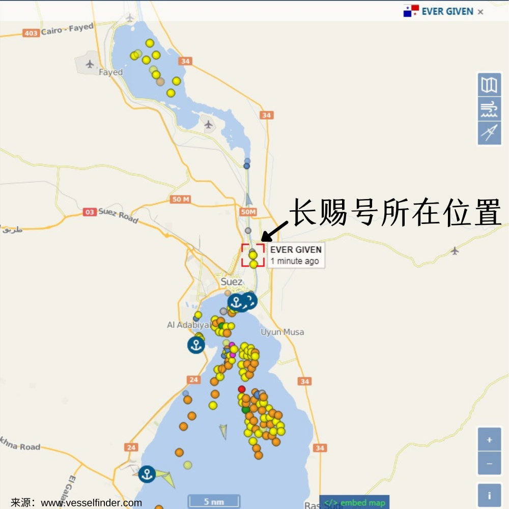 船舶实时位置网站数据显示,该巨轮卡在苏伊士运河南端以北不远处,船头朝东北,船尾朝西南,呈大约45度角。