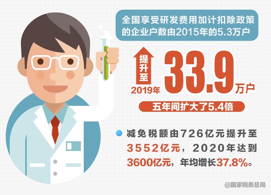 一组数据彰显成效:全国享受研发费用加计扣除政策的企业户数由2015年的5.3万户提升至2019年的33.9万户,五年间扩大了5.4倍;减免税额由726亿元提升至3552亿元,2020年达到3600亿元,年均增长37.8%。