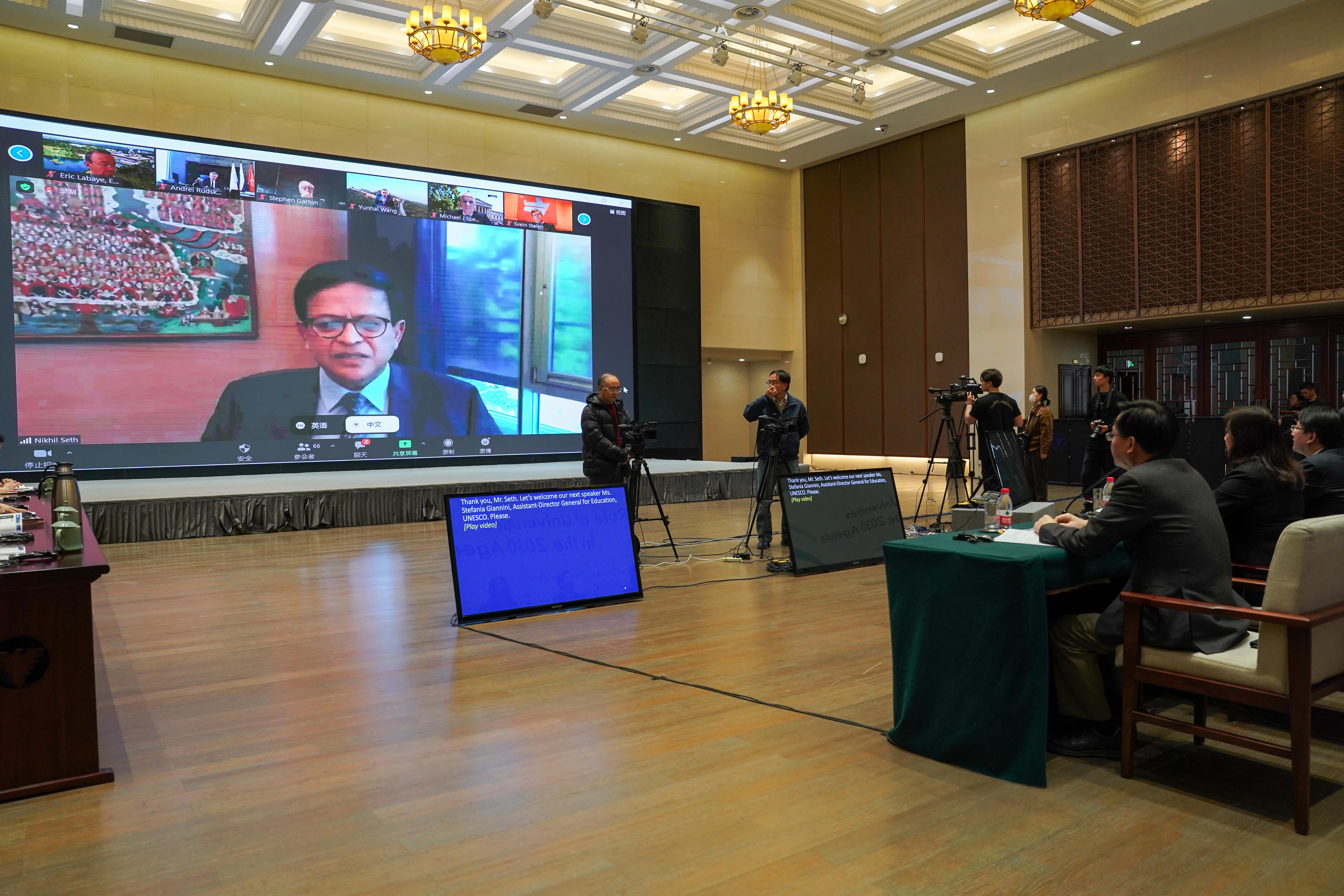 3月24日下午,联合国助理秘书长尼基尔·塞斯通过视频连线参与全球大学校长线上论坛。(新华社记者 殷晓圣摄)