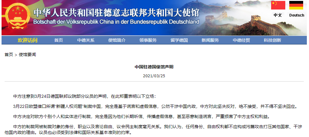 据中国驻德国大使馆消息,中方注意到3月24日德国联邦议院部分议员的声明,在此郑重表明以下立场: