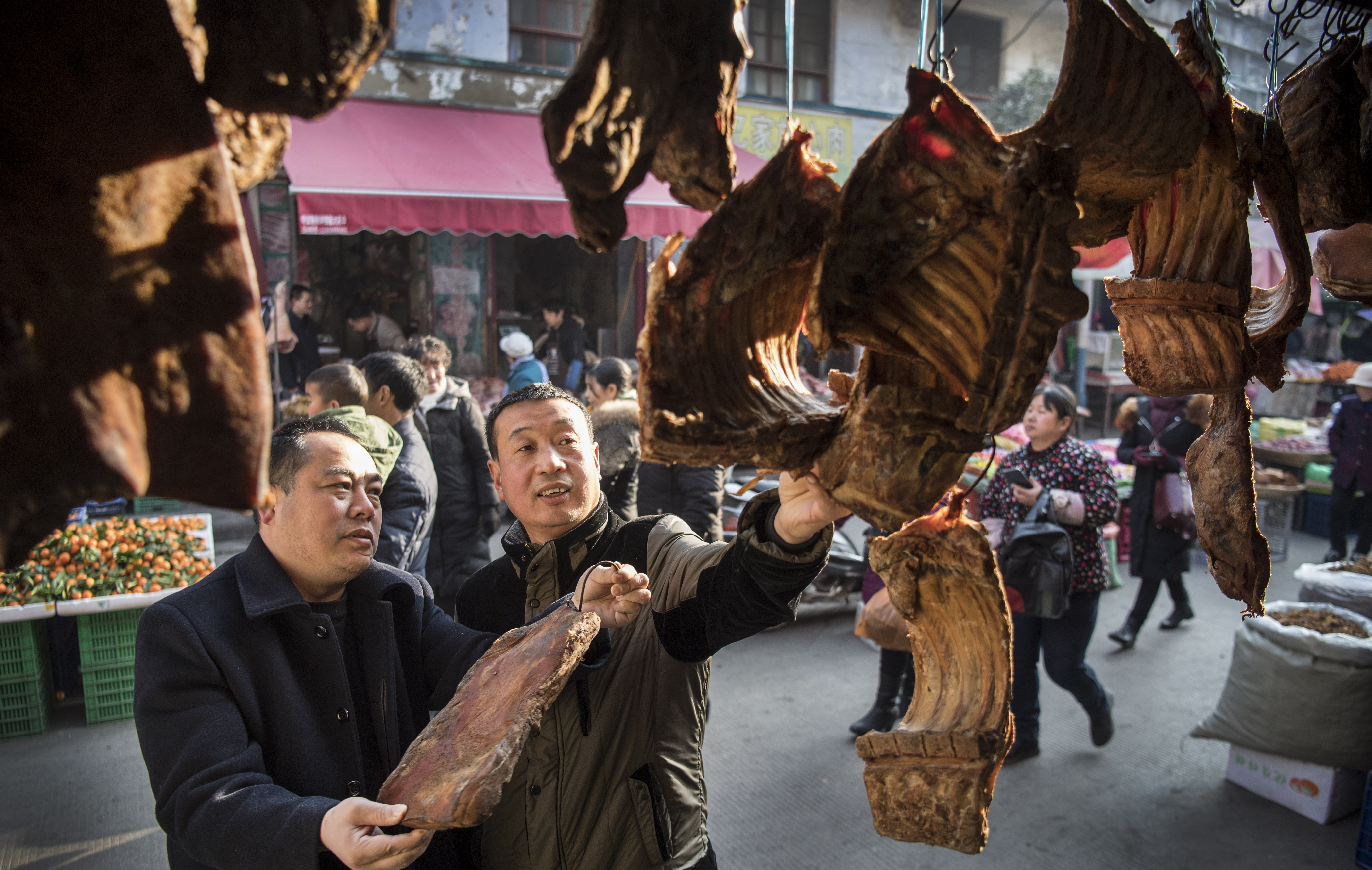 2019年1月23日,随着春节的临近,陕西省镇巴县城乡市场处处年味十足。当地居民在镇巴县城的农贸市场选购土特产腊肉。新华社记者 陶明 摄
