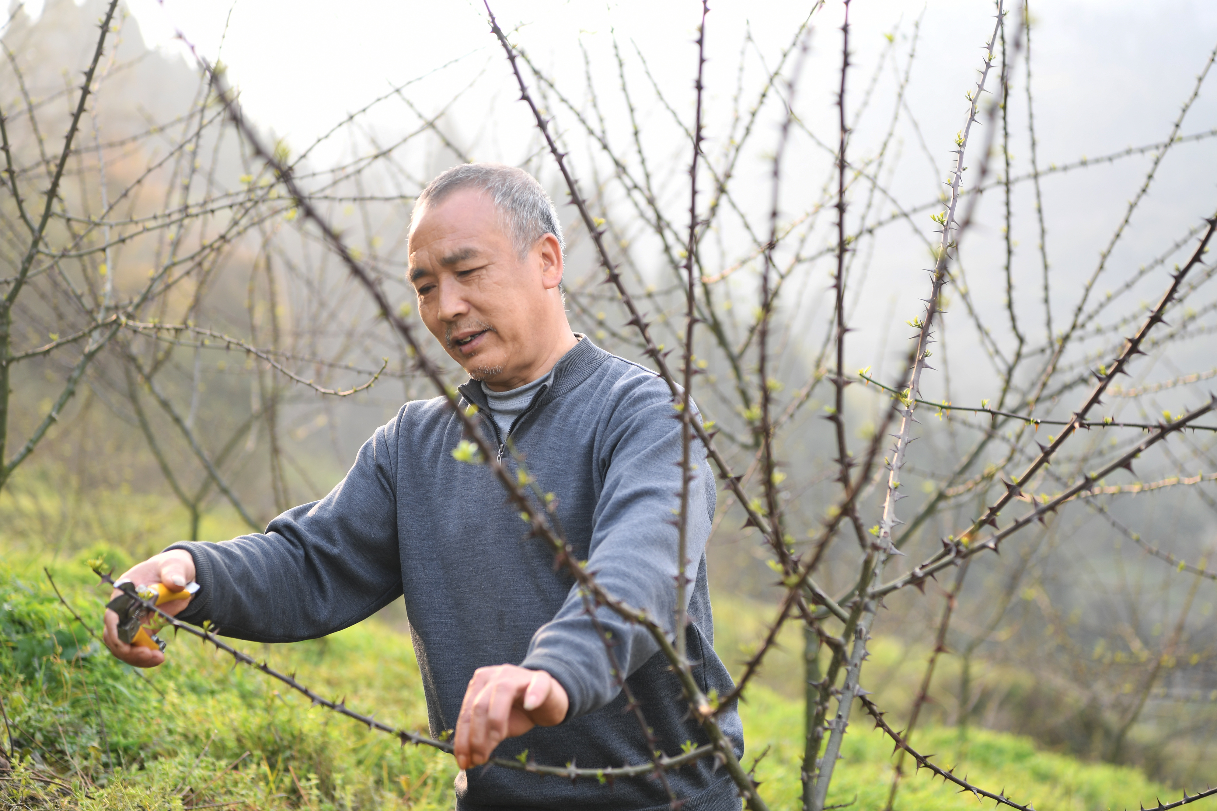 2018年3月14日,重庆市云阳县外郎乡五龙村村民在对花椒树进行管护。新华社记者 王全超 摄