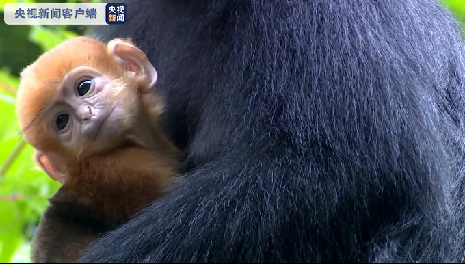 黑叶猴“猴宝宝”出生头6个月,全身呈金黄色。随着慢慢成长,绒毛逐渐变黑。最近只要天气晴朗,母黑叶猴就会抱着猴宝宝来到树上觅食,啃食嫩绿的枝叶。