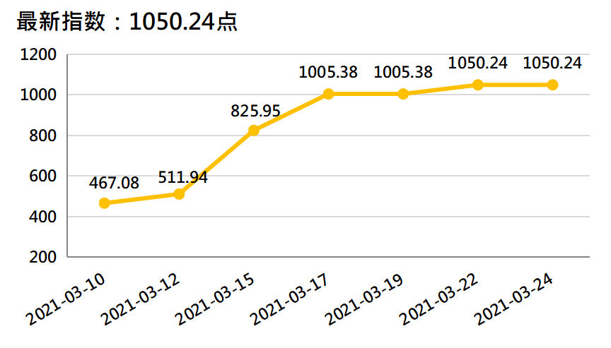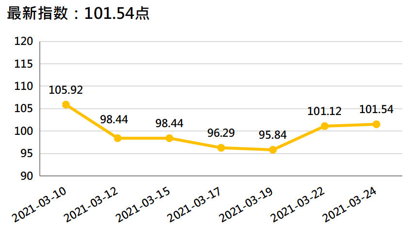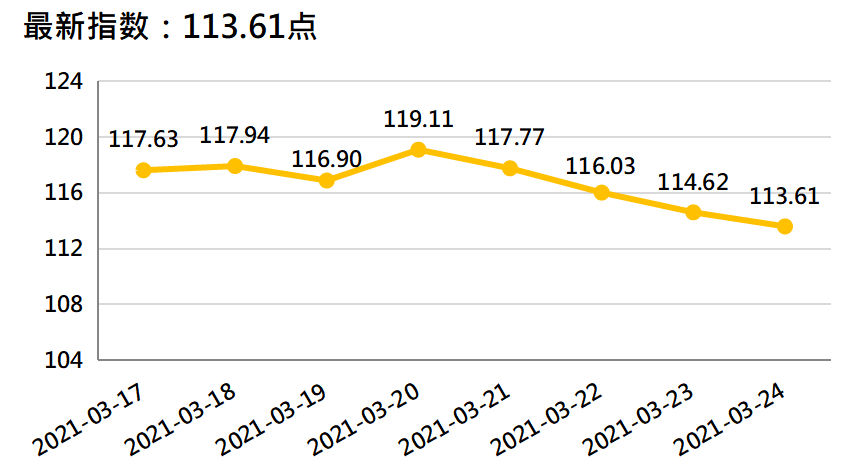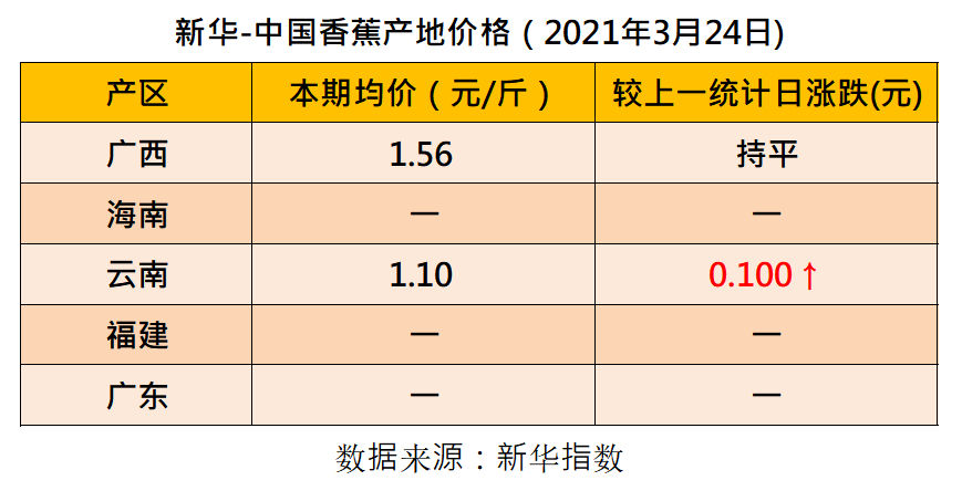 新华财经北京3月25日电(李水艳、李伯罧、薛志烜)新华-中国香蕉产业四大指数显示,截至2021年3月24日,国内香蕉产地价格指数报101.54点,较上一发布日(2021年3月17日,下同)96.29点上涨5.45%;香蕉销地批发价格指数报113.61点,较上一发布日117.63点下跌3.42%;进口蕉价格指数报926.53点,较上一发布日960.26点下跌3.51%;皇帝蕉产地价格指数报1050.24点,较上一发布日1005.38点上涨4.46%。