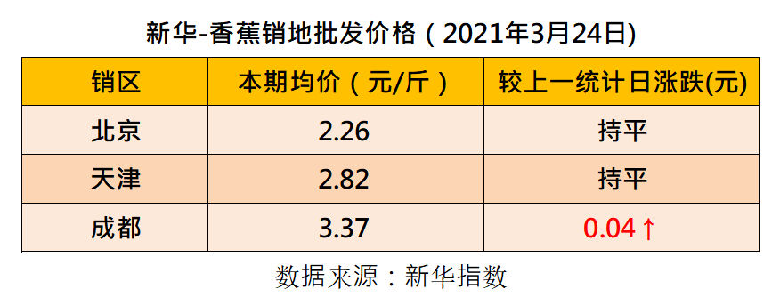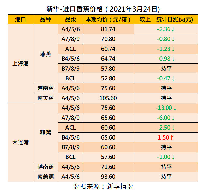 本监测期内(3月18日—3月24日),产区交易较上期增加,好货需求上涨,蕉价小幅回升;销地批发方面,市场需求一般,终端销售压力大,走货不快,价格呈下跌走势;进口蕉方面,受整体市场行情疲软影响,贸易商拿货谨慎,港口货源积压,大连港、上海港进口蕉报价持续下降;皇帝蕉方面,清明节临近,皇帝蕉市场需求阶段性增加,产区贸易商备货积极,蕉农报价上涨。