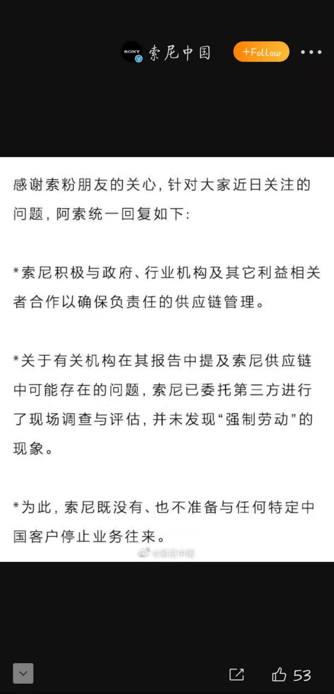 其第二点说明内容为,“关于有关机构在其报告中提及索尼供应链中可能存在的问题,索尼已委托第三方进行了现场调查和评估,并未发现‘强制劳动’的现象。”