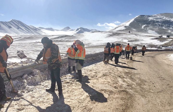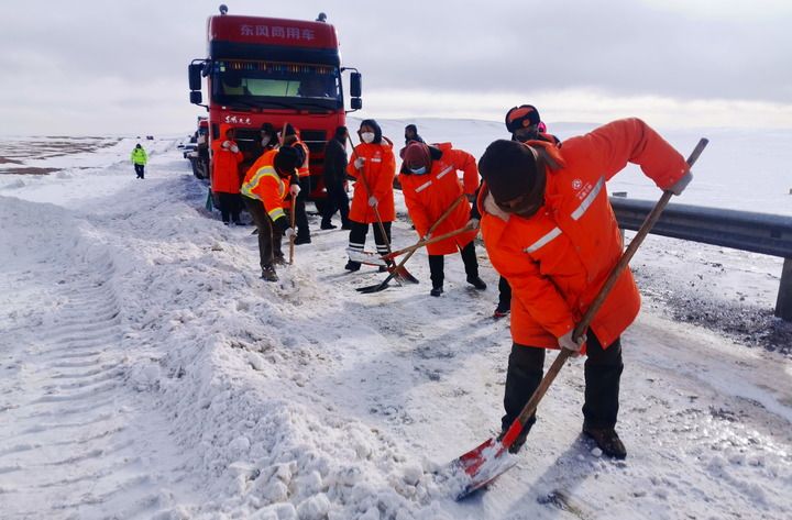 在国道109线K3349路段,安多公路养护段工作人员进行除雪除冰作业(2019年2月13日摄)。 新华社发(边巴央吉 摄)