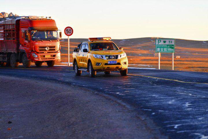 安多公路养护段巡护车和一辆货车行进在国道109唐古拉山口路段(1月13日摄)。 新华社记者 张汝锋 摄