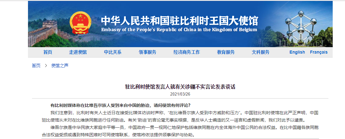 中国驻比利时使馆发言人25日表示,使馆方面注意到,比利时有关人士近日在接受比媒体访谈时声称,“在比维吾尔族人受到中方威胁和压力”。中国驻比利时使馆在此严正声明,中国驻比使馆从未对在比维族同胞进行任何胁迫。有关“胁迫”的言论毫无事实根据,是反华人士编造的又一谣言和虚假新闻,我们对此予以谴责。