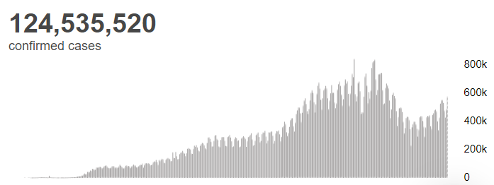 根据世卫组织最新实时统计数据,截至欧洲中部时间3月25日19时25分(北京时间3月26日2时25分),全球累计新冠肺炎确诊病例124535520例,累计死亡病例2738876例。25日全球新冠肺炎确诊病例新增575191例,死亡病例新增10421例。(总台记者 朱赫)