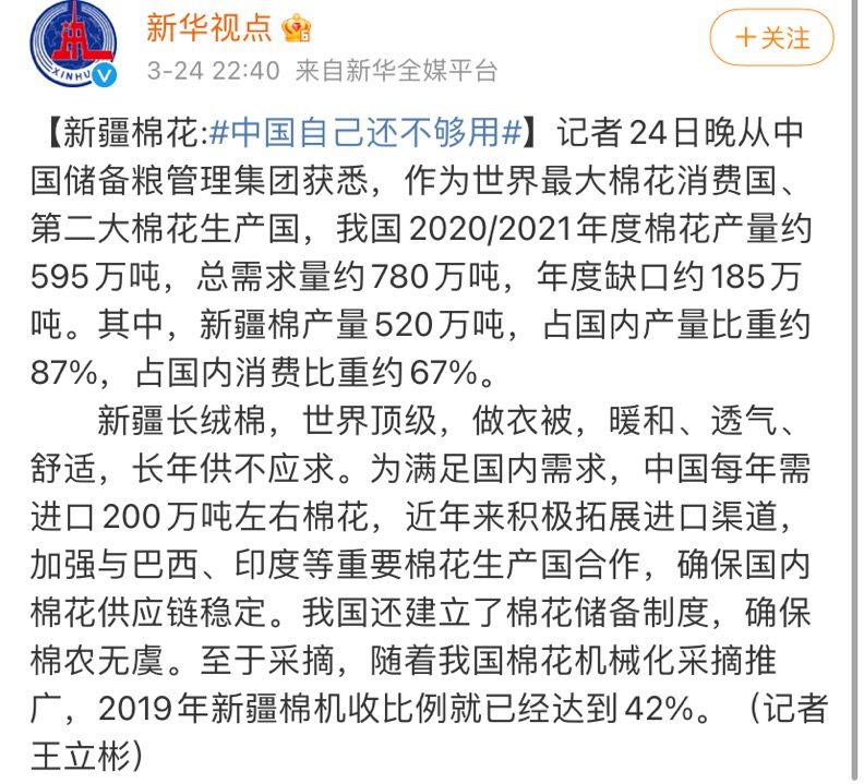 对此,新华社、人民日报等权威媒体纷纷发声,支持新疆棉花。新华社报道更是用数据表明:“新疆棉花:中国自己还不够用”。